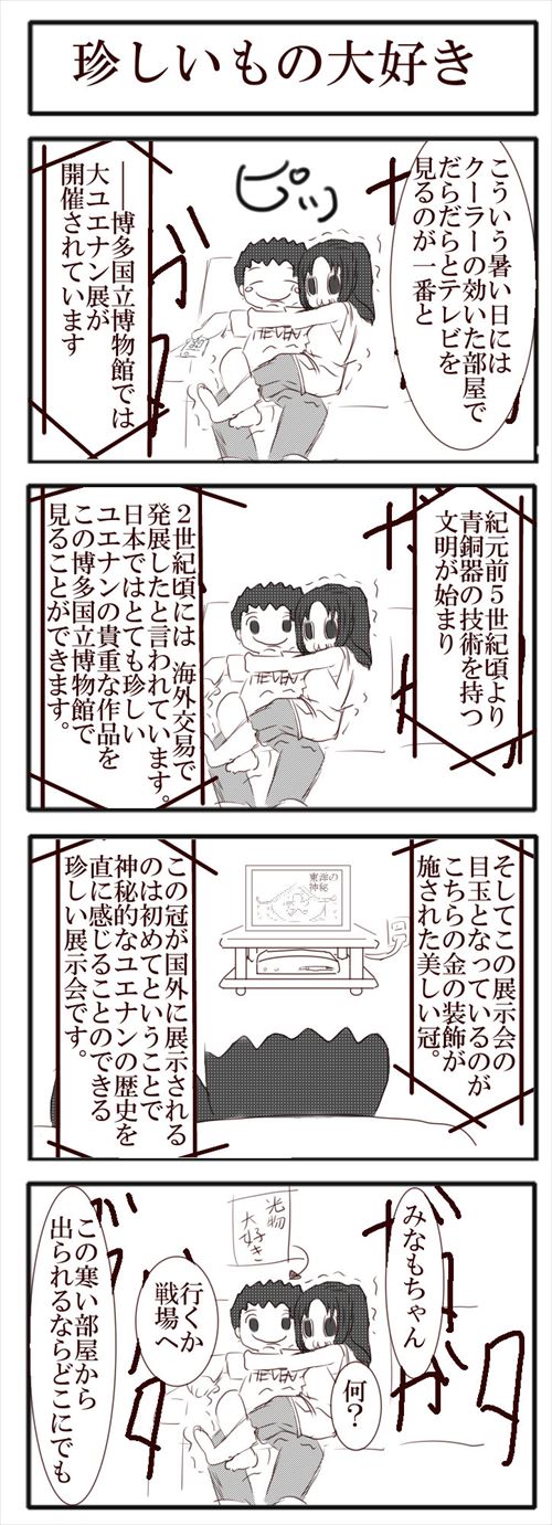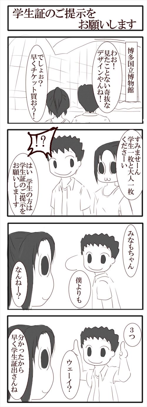 2015/07/12 №15 博物館に行くみなも なおや<博物館大好き!博物館めぐり大好き!もっとたくさんいこ!みなも<博物館は涼しいしあったかいから好き(真顔みなもちゃんたちのお話一覧は↓↓↓コチラ前 №14 梅雨が苦手なみなも次 №16 スマホゲームをするみなも その他のシリーズ デカ目のみなも 【キーワード:博多弁/4コマ/カップル/ほのぼの/ラブコメ/旅行】 不妊治療は保険適用です。 【キーワード:不妊治療/お金/保険適用/高度医療/コミックエッセイ】 神の見えざる日常 【キーワード:神様/かわいい/博多弁/ほのぼの】 華の立つ様 【キーワード:歴史/戦国時代/シリアス/立花誾千代/立花宗茂/】 その他、読み切り漫画などはこちら↓↓↓ スポンサーリンク スポンサーリンク 「デカ目のみなも[博多弁/4コマ]」カテゴリの最新記事