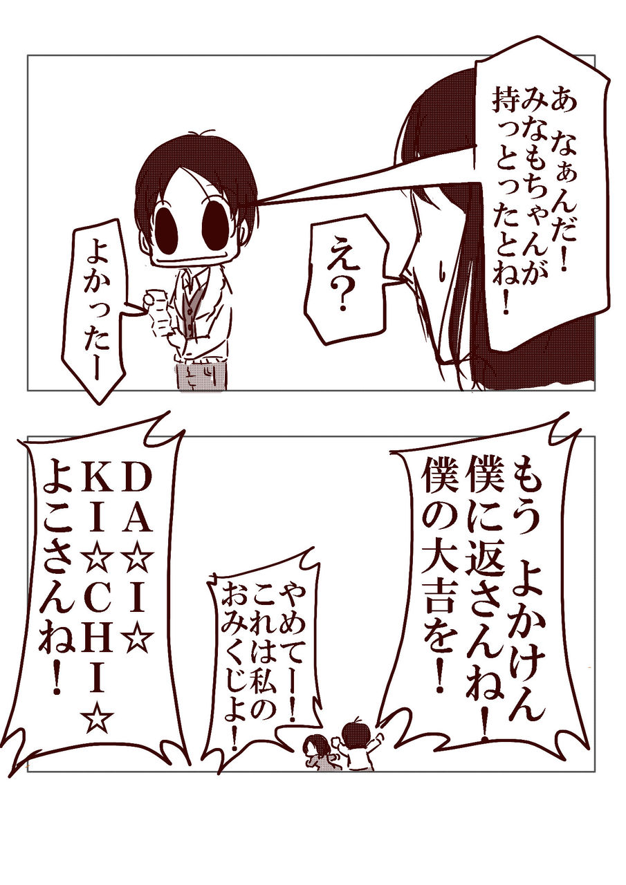 2018/01/21 大吉への執念[デカ目のみなも] 神様<なおや殿のあの大吉への執念はいったいどこから……阿吽<負けず嫌いなのでしょうみなもちゃんたちのお話一覧はコチラ その他のシリーズ デカ目のみなも 【キーワード:博多弁/4コマ/カップル/ほのぼの/ラブコメ/旅行】 不妊治療は保険適用です。 【キーワード:不妊治療/お金/保険適用/高度医療/コミックエッセイ】 神の見えざる日常 【キーワード:神様/かわいい/博多弁/ほのぼの】 華の立つ様 【キーワード:歴史/戦国時代/シリアス/立花誾千代/立花宗茂/】 その他、読み切り漫画などはこちら↓↓↓ スポンサーリンク スポンサーリンク 「デカ目のみなも[博多弁/4コマ]」カテゴリの最新記事