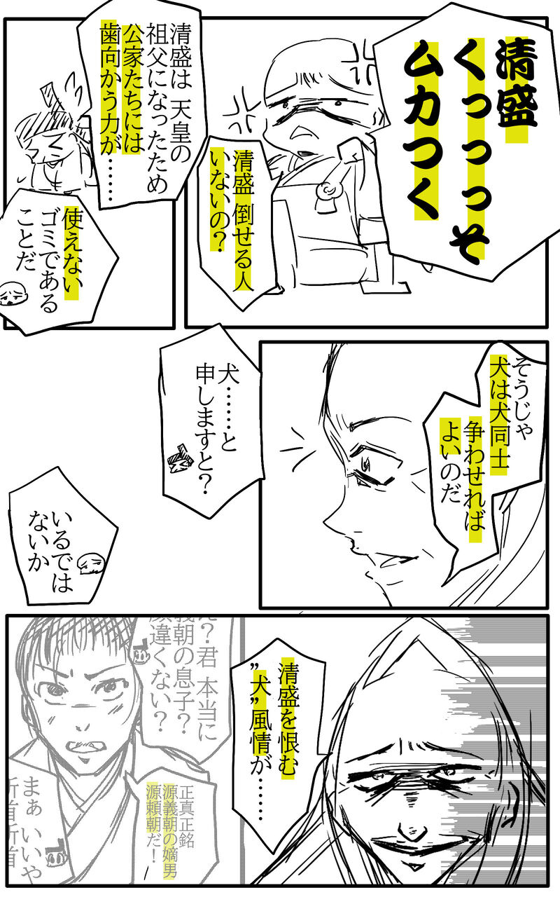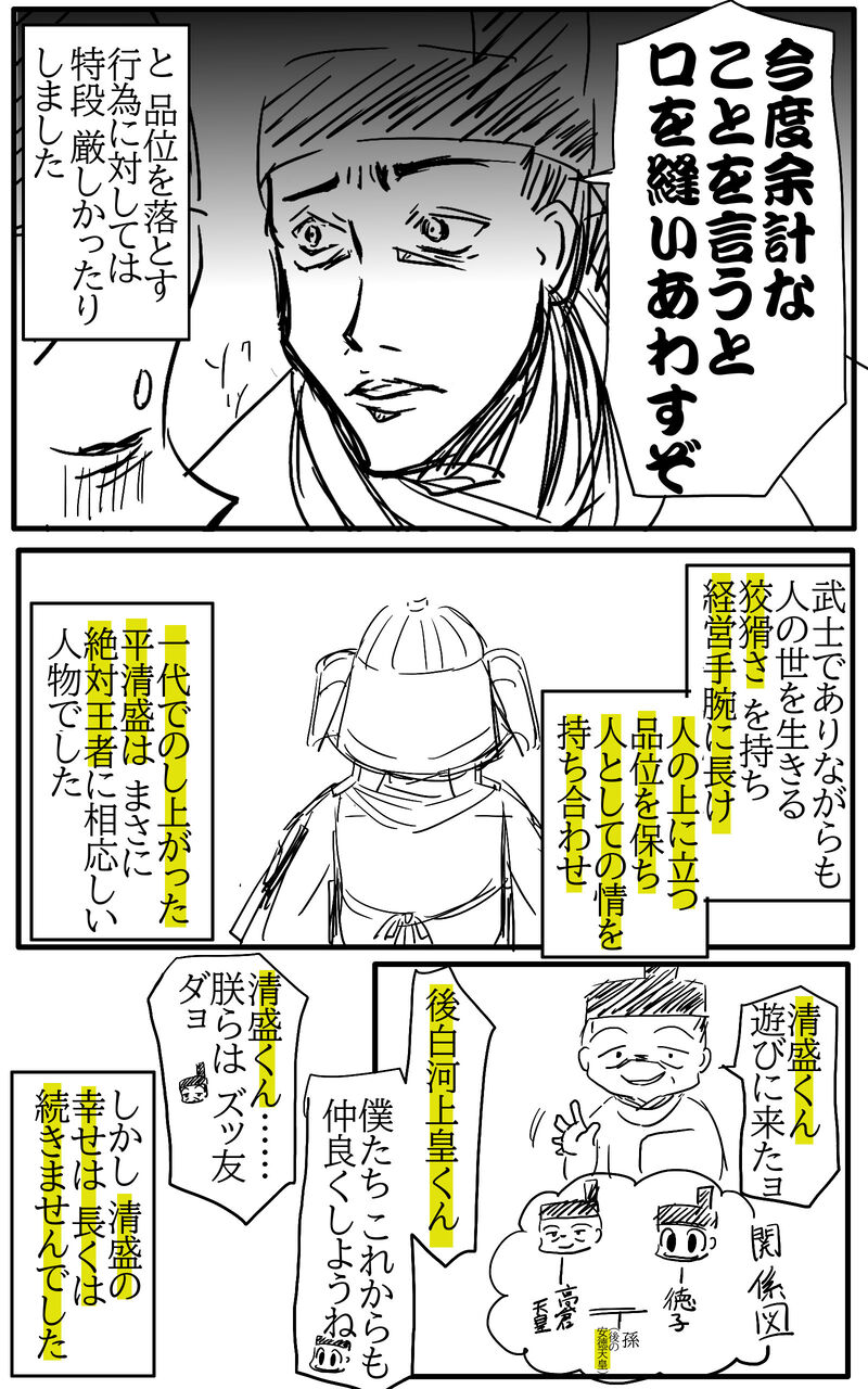 この物語は人生で初めて『平家物語』を読む中学生のために、少しでも興味を持ってほしいとギャグ要素多めで描いた漫画です。特に、作者が平家寄りの人間のために源氏方上記の点、ご承知いただけましたら、続きを見るよりご覧ください。